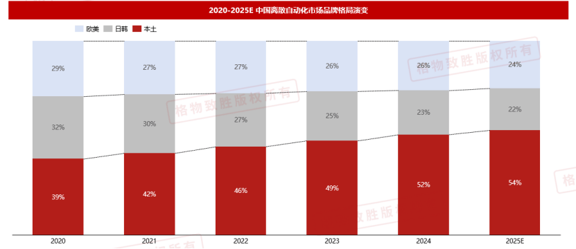 PLC产物市场国产化历程相对其他产线较慢,目前仍是欧美品牌从导市场,其门子表示较为强势。日系品牌PLC正在细密制制范畴品牌承认度较高,市占率相对较不变。国产玩家以中小型国产化替代策略+从动化处理方案策略快速推进市场份额的提拔。 保守从动化玩家为加强本身合作力,纷纷结构节制层产物,构成完整的从动化处理方案,如汇川,英威腾,伟创电气等玩家。 欧美系中小型PLC国产替代较为严沉,如西门子的Smart200系列,为应对国产的合作,成立CNP部分,优化小PLC产物,提高合作力。 通用伺服市场国产快速替代,近五年,国产市场份额添加20%,估计2025年市场份额接近60%,为应对国产化的合作,外资品牌纷纷提速中国当地化计谋的结构。 国产物牌市场份额快速增加,目前市场份额已达到52%,此中国产市场中汇川表示优异,伺服市场达到TOP1,低压变频器接近TOP1,并不竭拓展海外营业,提高国际影响力。 日系厂商专注小而精的产物市场,目前是国产替代的次要市场,部门日资企业起头结构中国当地化计谋,添加当地化研发出产发卖等。 离散从动化(FA)市场目前国产份额已跨越50%,手艺壁垒较低的产物线国产替代速度较快,如低压电机,通用伺服,低压变频器等产线。 ABB为提高市场所作力,不竭完美从动化产物布局,丰硕下业使用,拓展OEM市场,以优良处理方案的模式展开合作。 欧姆龙:计谋性规避伺服及低压变频器的国产化合作,转向强势的PLC手艺冲破,构成较强的手艺护城河。 欧美品牌集中正在大功率及中高端产物市场,市场玩家相对较少,份额相对不变,受国产物牌的冲击,仍呈现下滑态势。