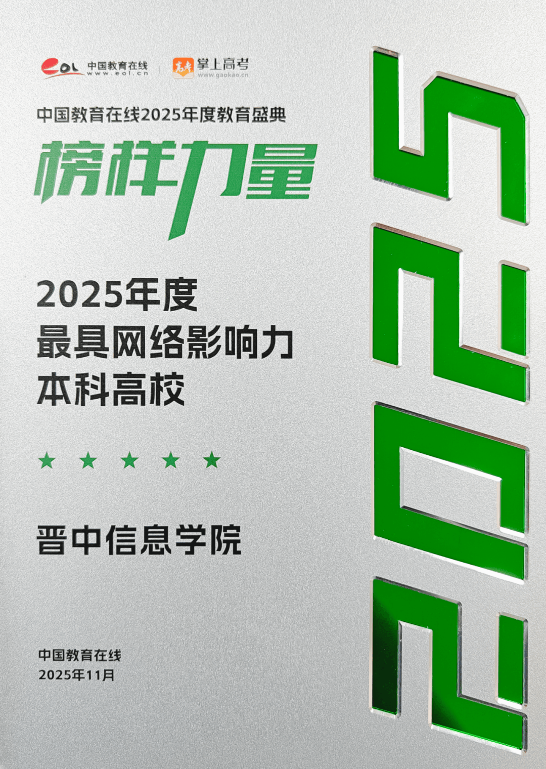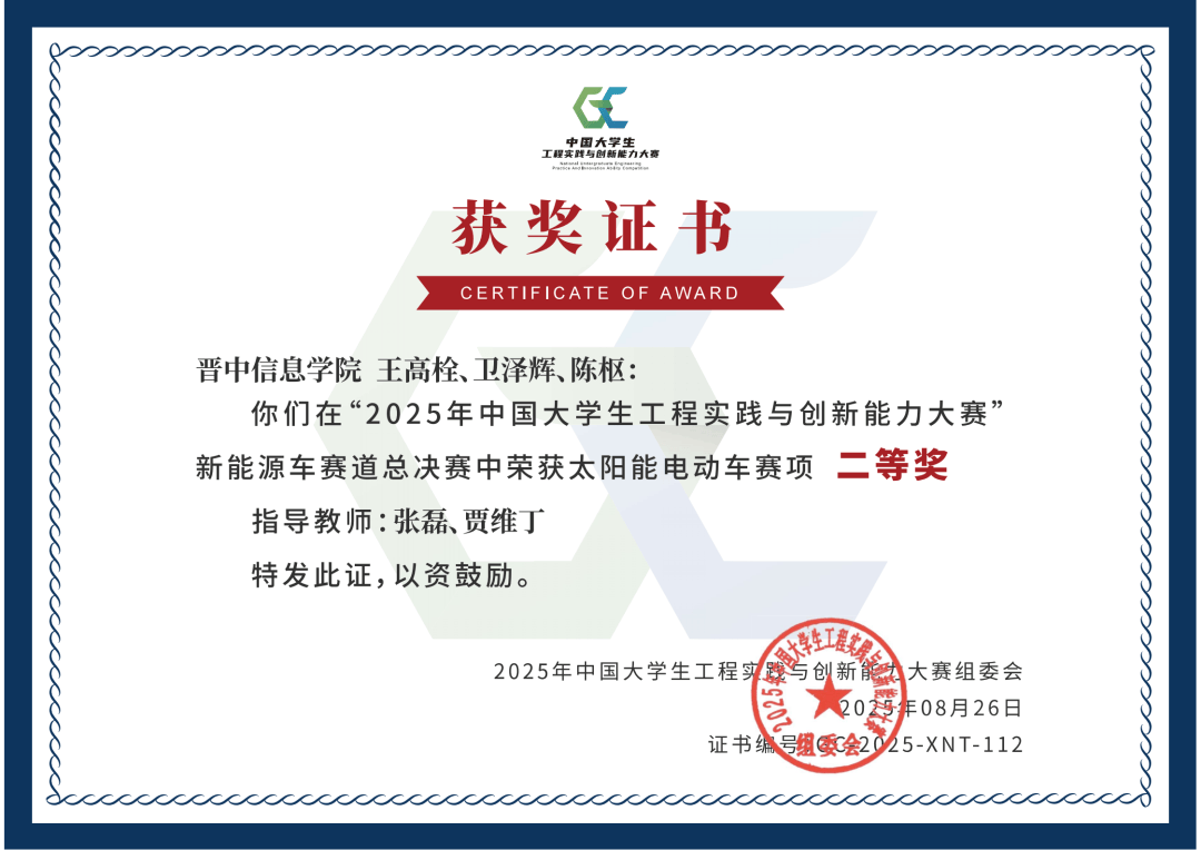 2025年,晋中消息学院全体师生凝心聚力、笃行致远。学院苦守“以学生为核心”的办学,深化“四位一体双院制”的育人模式,深耕使用型本科教育实践,持续推进讲授科研取办理机制立异,建立了多元的协同育人生态。正在师生的齐心奋进下,学校各项事业硕果盈枝、成效丰盛。现将2025年名誉榜面向全校师生公示,但愿大师再接再厉,共建特色育人品牌,帮力学校高质量成长新征程。 由中国贸易经济学会教育培训分会从办的“第五届全国大学生职业成长大赛”初赛本科生组马睿雯获一等。由长治市文化和旅逛局举办的第二届“上党回忆 长治有礼”山西长治文化创意设想大赛中赵子安获得三等。由出彩中国全平易近文艺组委会取百花杯保守艺术盛典栏目组举办的2024全国“百花杯”第三届中国保守艺术盛典收集展评大赛中张文斌、杨勋梅、张紫琼、李勃然、陈彦羚、郭惠诗等获得全国金;刘伊杭、马瑞莹、张怡然、高锌茹、王艺璇、张艺瀛等获得全国银。 由山西省教育厅组织的2025年度山西省高校思惟工做质量提拔分析取精品扶植项目申报,太行书院报送的太行教育获评2025年度省级红色文化。由新加坡国际跳舞节组委会举办的第十五届新加坡国际跳舞节中倪诗婷、梁睿坤、杨欣宇、任紫瑄、高靖瑶、刘一凡、李姝颖、王美娜等获得铜。 由全国高档院校古籍拾掇研究工做委员会从办,北大数字人文研究核心、字节跳动公益承办的“我是校书官”--古籍公共智能拾掇打算勾当中,学校艺术传媒学院意愿办事部荣获“优良组织单元”荣誉证书。 由中国光华科技基金会倡议以“科创强国 建梦将来”为从题的2025年寒假云课堂专项勾当,马睿雯同窗荣获“大学生意愿者证书”。由中国曲艺家协会从办的第二十届马街书会优良曲艺节目展演中,学校曲艺做品《非“礼”不嫁》做为优良曲艺节目进行展演。由新加坡人工智能基金会举办的第二届亚洲大学生创意设想展中,崔晓咏、陈瑞环、仇坤、孟令琪、原海晶、薛佳慧获得一等;赵子安、牛淑婷获得二等。由现代艺术文化研究院举办的2024首届青年立异设想中孟令琪、张瑞鑫获得二等,崔晓咏、陈瑞环、仇坤、原海晶、赵佳宜、赵子安获得优良。正在2025第二届大学生跨境电商立异创业大赛中吕、郝海鸿、申艺茹荣获创意营销赛全国优良。 正在2024“三晋杯”全国大学生英语翻译大赛中王永义、张钰茁获“英译汉”英语专业组一等;王芯悦获“英译汉”英语专业组二等;薛瑞霞获“英译汉”英语专业组三等;宋雨苗、韩森苗获“英译汉”英语专业组优良;郭凯英教员指点的韩森苗、王亚丽、薛慧茹做品获“英译汉”英语专业组优良,刘则茹做品获“汉译英”英语专业组三等。由山西省教育厅从办,山西工程科技职业大学、山西省教育成长办事核心承办中国工商银行股份无限公司山西省分行赞帮的“工行杯”山西省第二届大学生职业规划大赛省赛中李佳同窗获高教成长赛道(本科)三等;李培豪同窗获高校就业赛道(本科)三等。由山西省委社会工做部从办,山西承办的山西省首届新时代意愿办事项目大赛,学校经禧歆愿专项意愿办事队“光阴爱人圆梦打算”意愿办事项目荣获一等。 由山西省大气探测手艺保障核心支部委员会从办的大学生景象形象科普社会实践勾当中,学校近景学院王琰鹏、和艺群、侯雅茜、澹台旭辰、袁悦婷、刘婉银、马淑慧获满意愿办事证书。由山西省人力资本和社会保障厅、共青团山西省委、山西省青年结合会做出表扬决定,授予晋中消息学院智能工程学院团总支“山西省五四红旗团支部”荣誉称号。 由武汉大学举办的第四十二届全国大学生樱花诗歌邀请赛,创意写做学院学生陈志怯做品《青年农人糊口指南》(外4首)获得创做组三等。由山西省委社会工做部等部分组织的2024年度山西省意愿办事先辈典型宣传勾当中,学校教师荣获“先辈工做者”荣誉称号。由共青团地方、中国光华科技基金会配合从办的2024年度“斑斓中国 芳华步履”全国全平易近光盘步履中,学校教师荣获“优良指点教师”荣誉。由山西省大气探测手艺保障核心从办的2025年世界景象形象日科普日勾当中,学校近景学院荣获“优良组织单元”,学校学生获得优良意愿者称号。2025全国第四届“盛世杯”(收集)电视大赛暨中汉文化艺术节,侯佳妙、张昱斐荣获集体铜;淬炼商学院·国际商学院武诗翔同窗荣获国度级铜;赵琰荣获铜;倪诗婷获得铜,倪诗婷、梁睿坤、杨欣宇、任紫瑄、高靖瑶、刘一凡、李姝颖、王美娜、郭懿文、武诗翔等获得人气;郭懿文加入的《见山见海见本人》荣获集体铜;程宇涵加入的《琉想》荣获国度级集体人气。正在“正大杯”第十五届全国大学生市场查询拜访取阐发大赛中,王江骥、阮啓源教员指点的任晋、刘婉银、王昕、宋柄彤团队荣获山西省省赛二等;阮啓源、张雅淇教员率领的刘益、刑雄伟、武昌媛、林秀芝、李荣团队,以及张彩丽、董杰、索焓雪团队均荣获省级一等,刘婉银,任晋,王昕,宋柄彤,获省级二等。由山西省工业取使用数学学会举办的2025年“金地杯”山西省大学生数学建模角逐中,学校近景学院安妮娜、杨赫瑶、马雯菲、耿玮、温梦晶,张瑞婕、高凡越、郭细雨荣获省二等;史郑旭、王雪奋、李泉荣,梁佳慧获省级三等。由山西省委教育工委、山西省人平易近防地扶